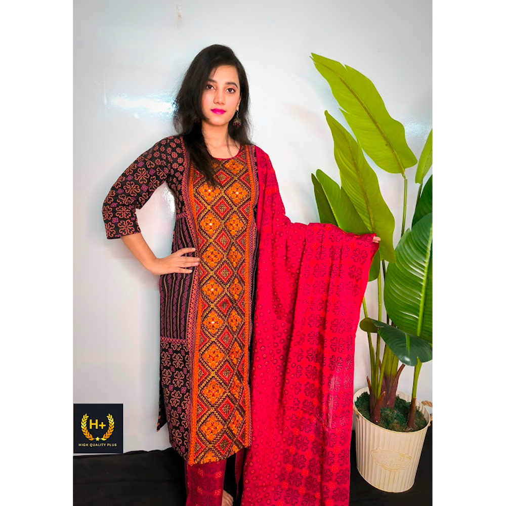 "Code: HPL-ACD-BLACK-QUEEN-2502 Fabric: 100% Pure Cotton with All-Over Screen Print Set Includes: Stylish Kameez 5-Hand Length Cotton Namazi Orna Screen Printed Salwar Available Sizes: 36, 38, 40, 42, 44, 46 Color & Print: Guaranteed vibrant color that won’t fade – long-lasting screen print technology Comfort Fit: Super breathable and perfect for long hours outside the home Style & Functionality: Ideal for students, office-goers, and everyday casual wear 🛍 Available in multiple colors and designs. 📸 Note: Actual product color may slightly vary due to lighting and screen resolution."