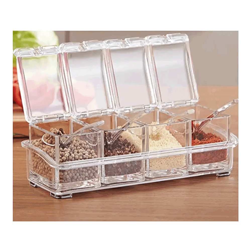 Introducing our 4 Grid Acrylic Seasoning Spice Box Kit with Spoon, perfect for organizing your kitchen spices and condiments. Made with high-quality acrylic material, this crystal clear spice box is not only durable but also adds a touch of elegance to your kitchen. The 4 compartments allow you to store different spices and seasonings, while the included spoon makes it easy to measure and dispense the right amount of seasoning. This spice box is a must-have for any kitchen and is perfect for those who love to cook and experiment with different flavors. Keep your kitchen organized and your spices easily accessible with our 4 Grid Acrylic Seasoning Spice Box Kit with Spoon.