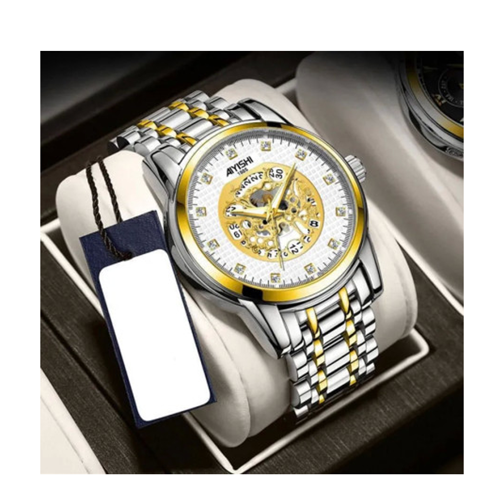 The AIYISHI Skeleton 4466 Wrist Watch for Men in White is a stunning timepiece that offers a captivating blend of elegance and sophistication. This wristwatch features a white case and strap, complemented by a skeletonized dial that showcases the intricate inner workings of the watch. The transparent dial provides a unique and mesmerizing view of the gears and mechanisms, creating a sense of fascination. With its automatic movement, this AIYISHI watch is self-winding and does not require a battery, adding to its charm. The white color adds a touch of refinement and versatility, making it suitable for both formal and casual occasions. The AIYISHI Skeleton 4466 Wrist Watch for Men in White is a remarkable accessory that combines exceptional craftsmanship with a modern design, making it a standout choice for watch enthusiasts and individuals who appreciate a stylish and unique timepiece.