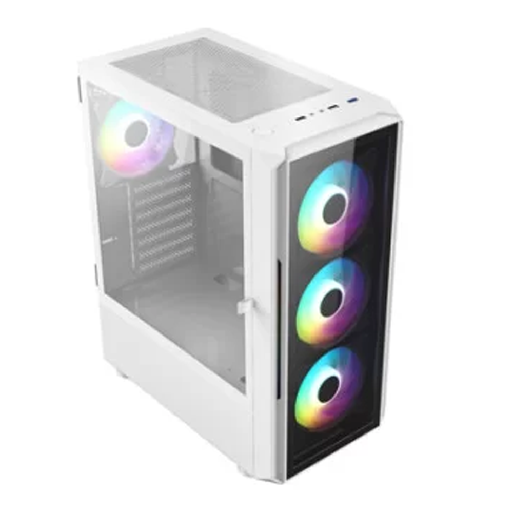 Split Gaming case Structure with Metal Top Cover, Support ATX PSU in Buttom, Support ATX motherboard, Placed 2*SSD,2*HDD,No ODD, Front Panel ABS White+Glass white, 1*USB3.0(Fake)+2*USB1.0+HD AUDIO, Right Side Panel with Metal, Left Side Panel tempered glass with 4pcs screw, 7 slots, K=A Carton, Poly foam, Not include cooling fan.