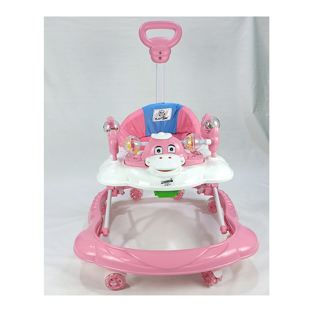 This is a baby walker perfect for a 6-18 month old baby. Walkers are great for helping babies learn to walk. The walker is very small and perfect for baby size. The baby seat is made of soft fabric, which gives extra comfort to the baby. The rear handle allows the child to be seated and moved forward. The walker has lights and music (requires batteries to play music, which are not included with the product).