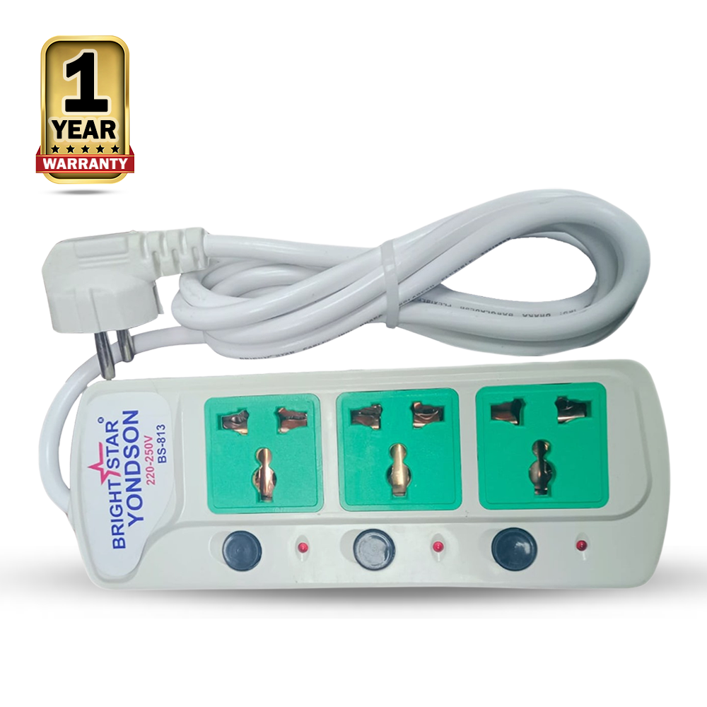 The Bright Star Multi Socket 3-port with a 2-meter cable, model 813, is a reliable solution for powering multiple devices simultaneously. Its fireproof plastic body ensures safety, while high-quality contacts and copper cable guarantee durability and efficient power transmission. With a generous cable length of 2 yards, it offers flexibility in placement. The product comes with a 1-year warranty, assuring its quality and longevity. Featuring individual switches for each port and a power indicator light, it offers convenience and ease of use. Ideal for various applications, this multi-socket delivers reliable performance for your electrical needs.