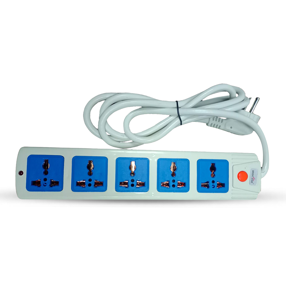 Introducing the Bright Star Multi Socket 5-port with a 2-meter cable, model 105, engineered by Brightstar to meet your electrical needs. Boasting five ports, it provides ample connectivity options for various devices. Operating at a rated voltage of 250V and current of 10A, it ensures reliable power delivery with a frequency of 50Hz. The main single switch offers convenient control, while the power indicator light keeps you informed of its status. Inside, a copper bar connection ensures stable performance, with the PC body materials guaranteeing durability. The highly elastic phosphor bronze terminals securely accommodate plugs from all countries, ensuring versatility. Engineered with a 5-pin socket design to prevent electricity leakage, it prioritizes safety during operation. Beyond its functionality, its elegant design makes it a decorative addition to any space.