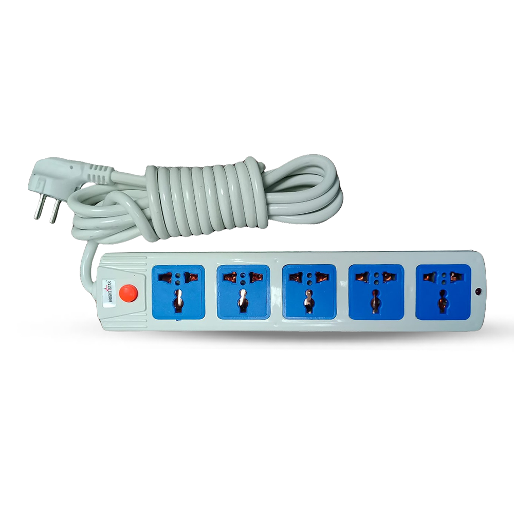 Introducing the Bright Star Multi Socket 5-port with a 5-meter cable, model 105, engineered by Brightstar to meet your electrical needs. Boasting five ports, it provides ample connectivity options for various devices. Operating at a rated voltage of 250V and current of 10A, it ensures reliable power delivery with a frequency of 50Hz. The main single switch offers convenient control, while the power indicator light keeps you informed of its status. Inside, a copper bar connection ensures stable performance, with the PC body materials guaranteeing durability. The highly elastic phosphor bronze terminals securely accommodate plugs from all countries, ensuring versatility. Engineered with a 5-pin socket design to prevent electricity leakage, it prioritizes safety during operation. Beyond its functionality, its elegant design makes it a decorative addition to any space.