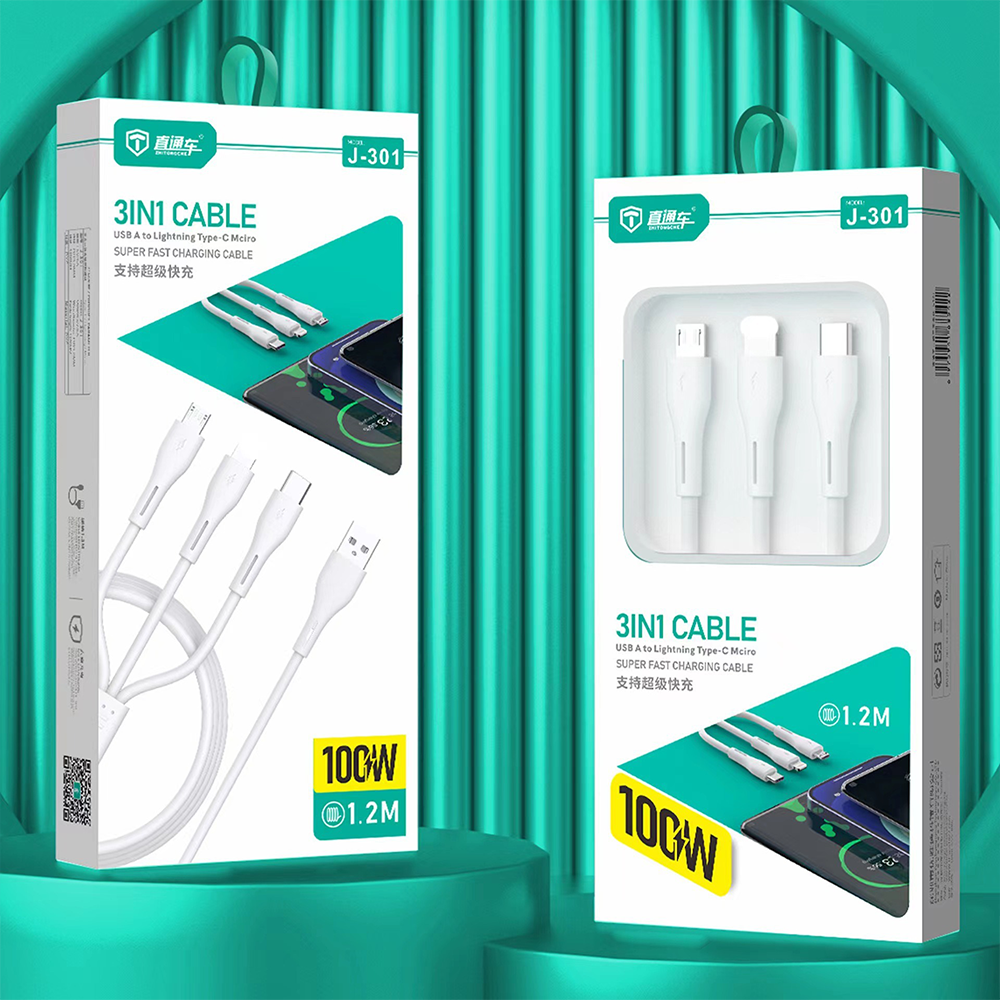 The CASIFY J301 is a high-performance 3-in-1 charging cable designed to streamline your charging needs. It features three connectors in one: USB Type-C, Lightning, and Micro USB, making it compatible with a wide range of devices, including smartphones, tablets, and other USB-powered gadgets