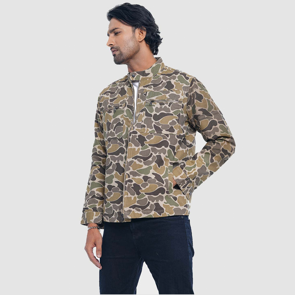 Stay stylish and protected in this Men's Casual Biker Jacket in Camo Print. Made from durable canvas cotton fabric, it features two metallic zippers on the front pockets, a single open metallic zipper on the chest, and decorative snap buttons on the cuffs. With a regular fit and two bone pockets, it's the ideal combination of rugged functionality and modern design. Size: S, M, L, XL, XXL