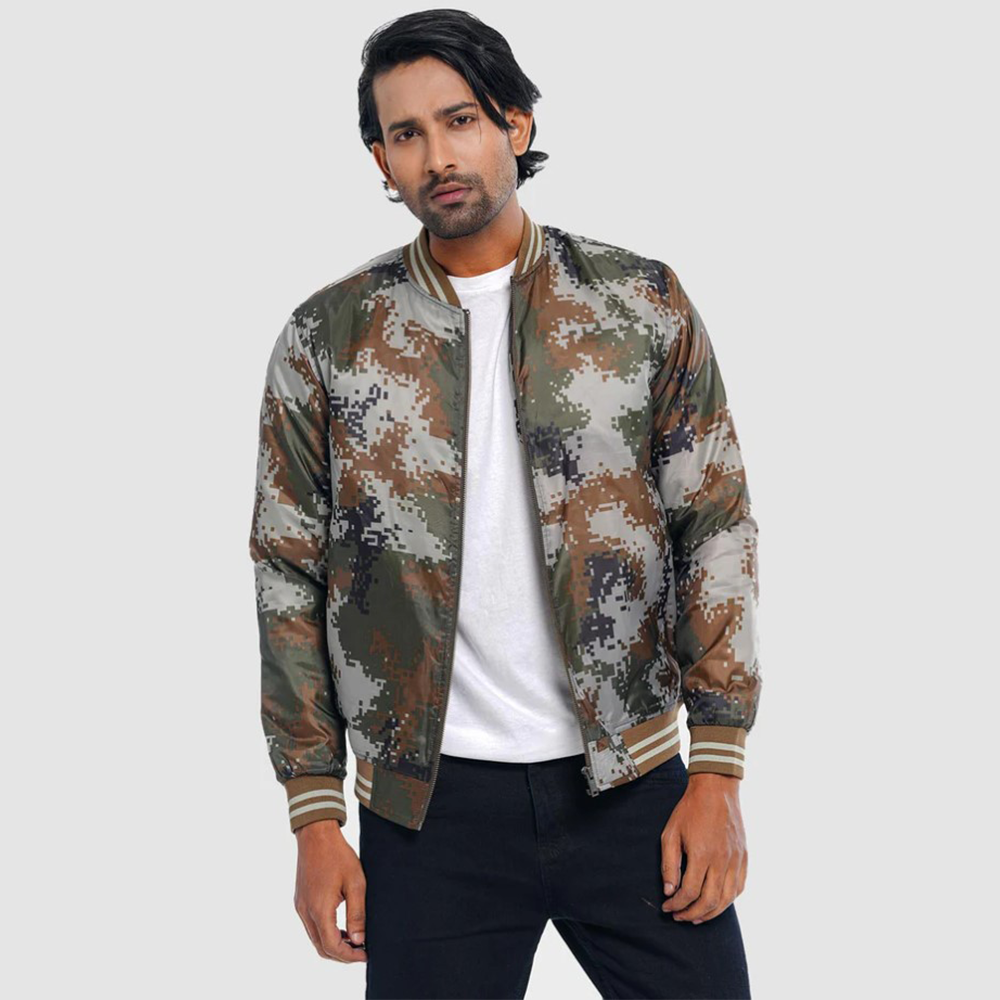 Introducing our Men's Casual Bomber Jacket in Olive Camo. Made from premium taffeta fabric, this sleek bomber jacket features a metallic zipper, padded inner lining for warmth, and ribbed cuffs, collar, and bottom hem for a stylish finish. With a regular fit and two bone pockets, it's both comfortable and functional. Upgrade your style game now.