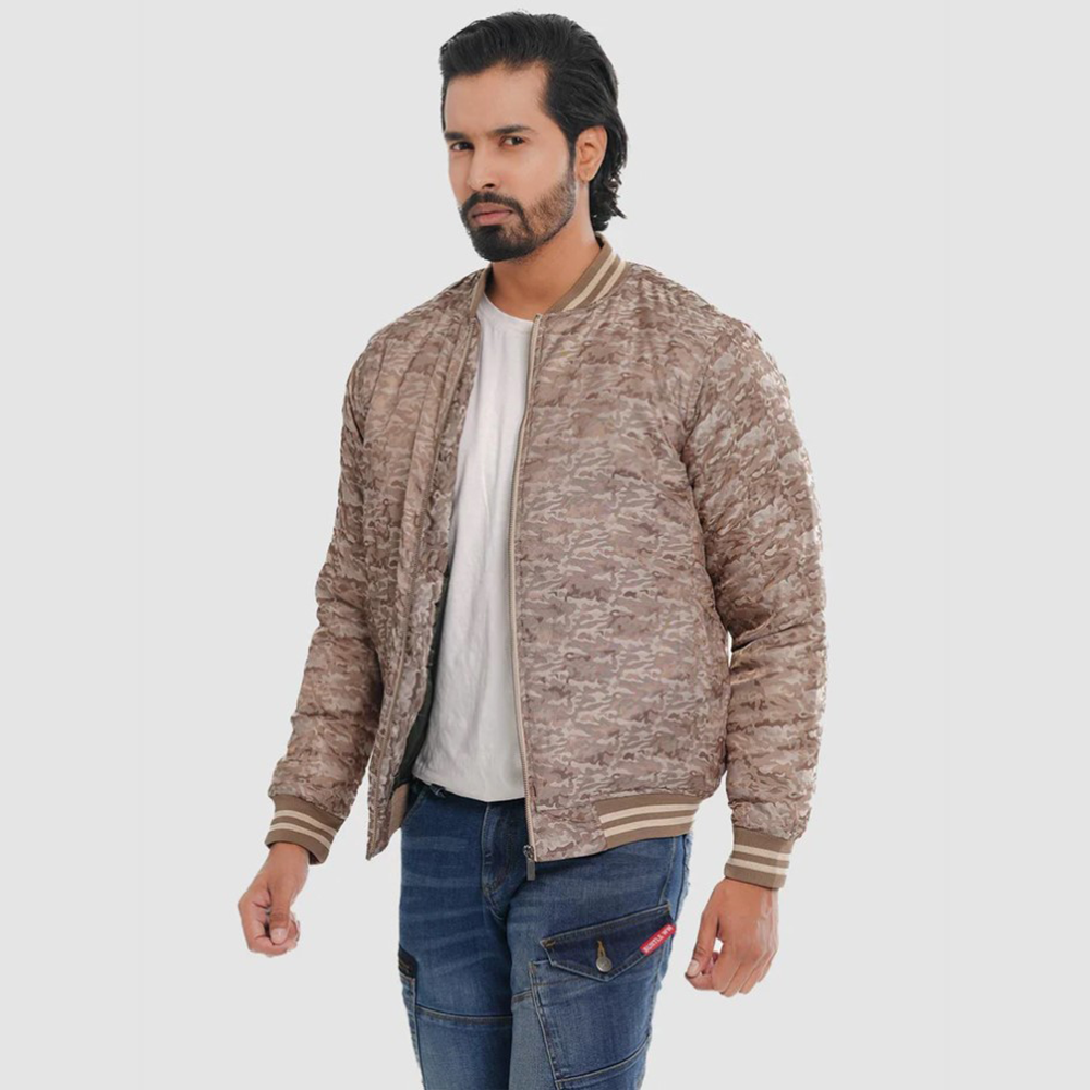 This premium taffeta Bomber Jacket in Sand Brown is a sleek and stylish addition to any man's wardrobe. Featuring a metallic zipper, padded inner lining for warmth, and ribbed cuffs, collar, and bottom hem, this jacket effortlessly combines classic design with modern flair. Upgrade your style and comfort with this versatile piece.