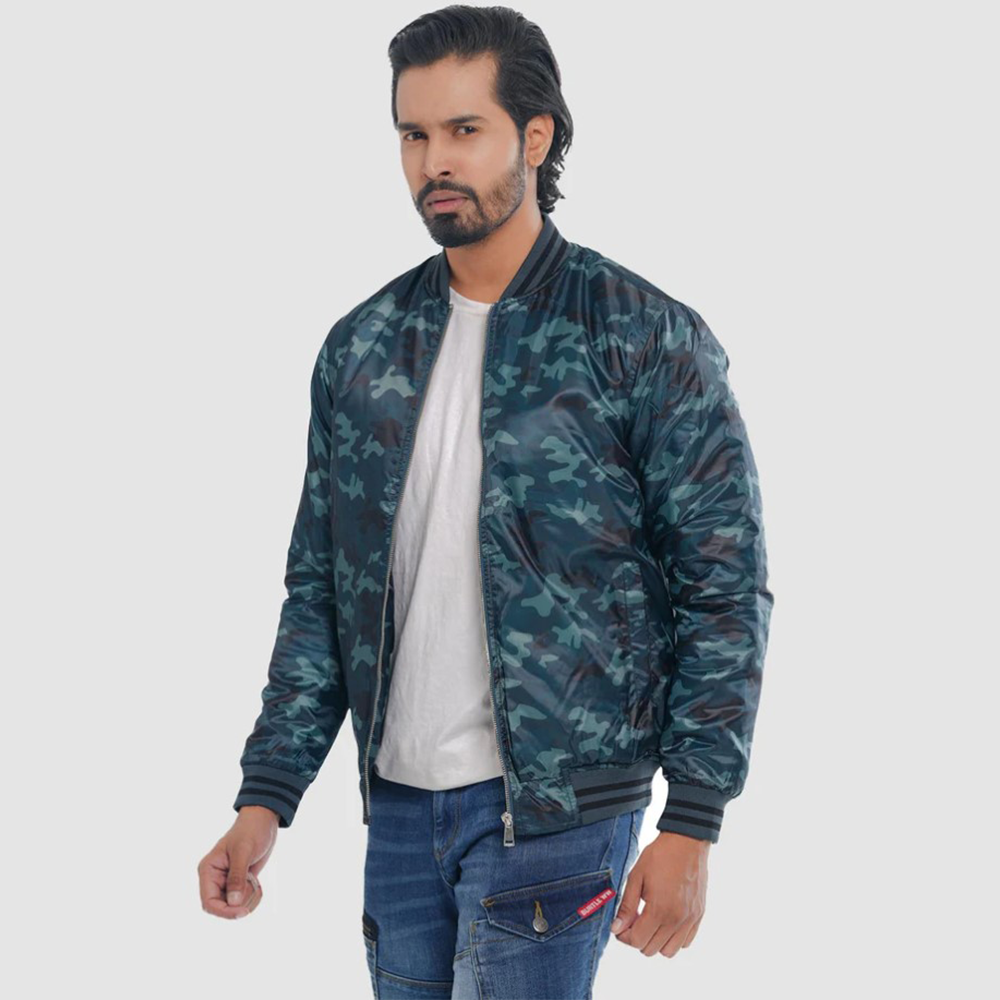 Introducing the Men's Casual Bomber Jacket Teal Camo. Crafted from premium taffeta fabric, this sleek bomber jacket features a metallic zipper and padded inner lining for warmth. The ribbed cuffs, collar, and bottom hem add a stylish, textured finish. Perfect for the modern man looking for both style and comfort.