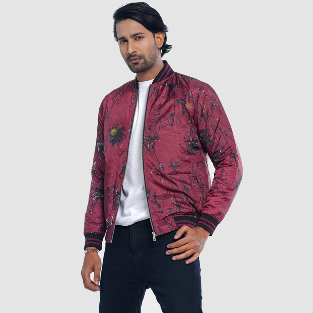 Stay warm and stylish with our Men's Casual Bomber Jacket in Bee Print. Made from premium taffeta with a metallic zipper and ribbed cuffs, collar, and bottom hem for a sleek finish. The padded lining provides warmth, while the two bone pockets add functionality. Elevate your look with this classic and modern piece.