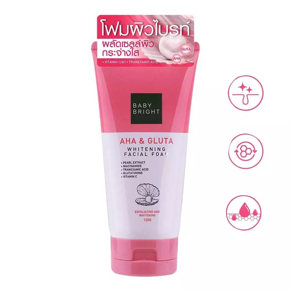Baby Bright AHA & Gluta Whitening Facial Foam, an ultimate facial cleanser that purifies the skin with luscious, dense foam. With a combination of AHA (Alpha Hydroxy Acid), glutathione, and vitamin B3 to neutralize free radicals and decongest pores, this oil-control cleanser helps boost moisture and radiance.