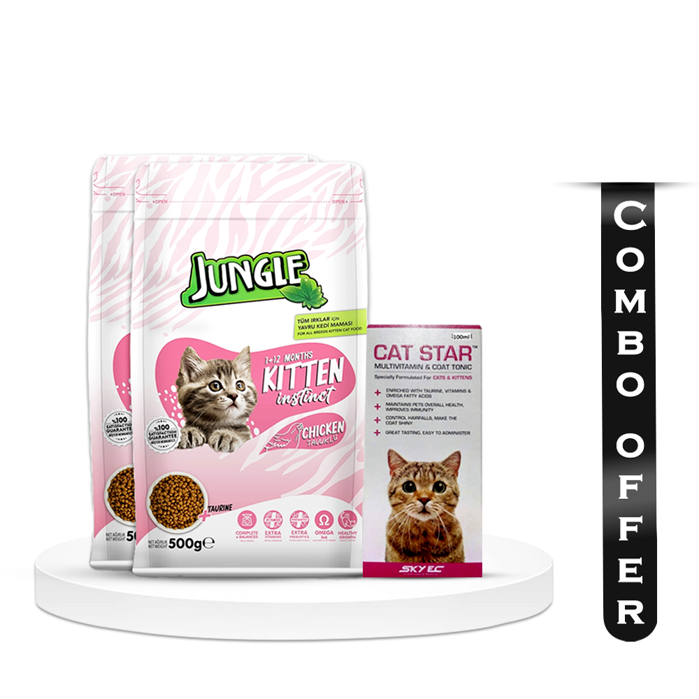 Jungle 500 Gr Kitten Food Chicken - It has been carefully formulated by cat & dog nutritionists using quality ingredients so that kittens can receive the daily nutrients they need for healthy growth in a complete and balanced manner. It is also enriched with Omega-3 fats and essential vitamins and minerals to support a healthy metabolism and bone development. Cat Star Multi-Vitamin and Coat Tonic for Cats and Kittens is a 100ml liquid supplement designed to support the overall health and well-being of cats and kittens.