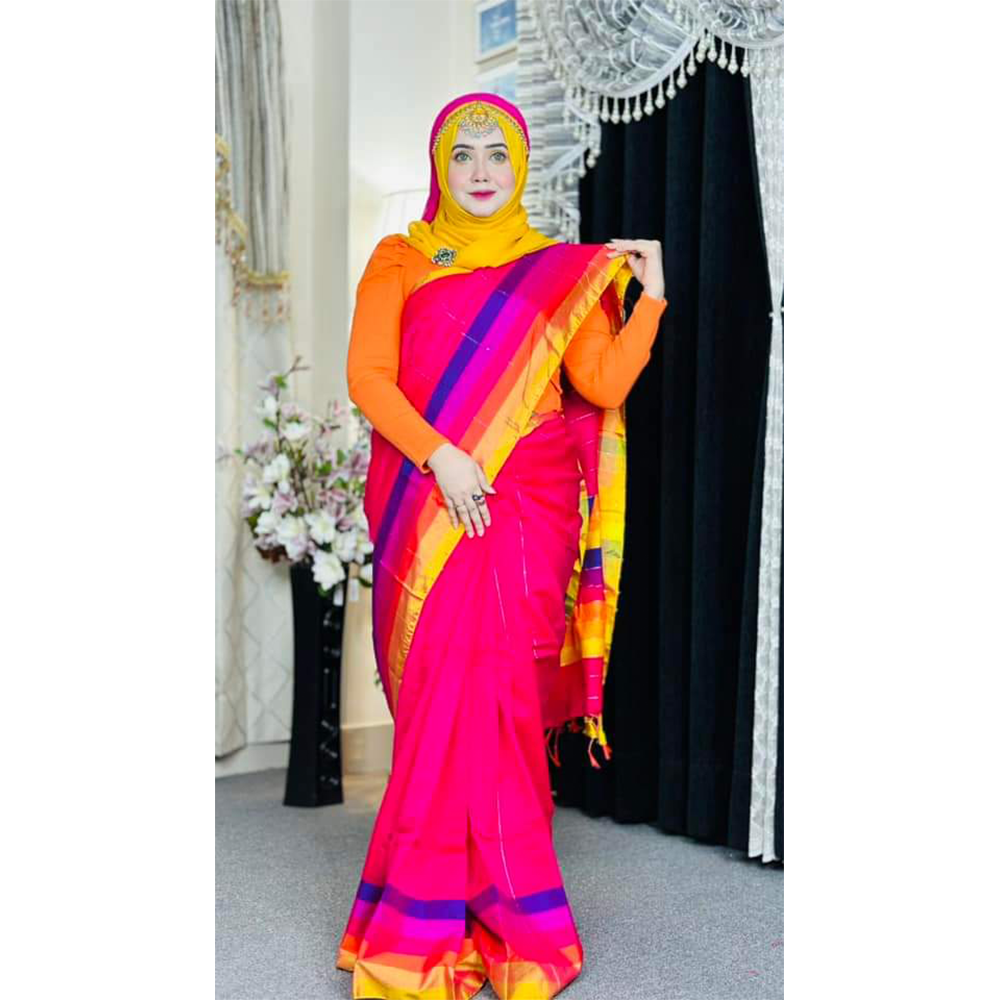 13-hand saree with rainbow border with beautiful queen pink color texture with zero sequence work. It is tasseled. No blouse Piece. A soft and comfortable saree made of high-quality material of tasar half silk is perfect for a wedding, yellow, picnic, or any occasion this summer.