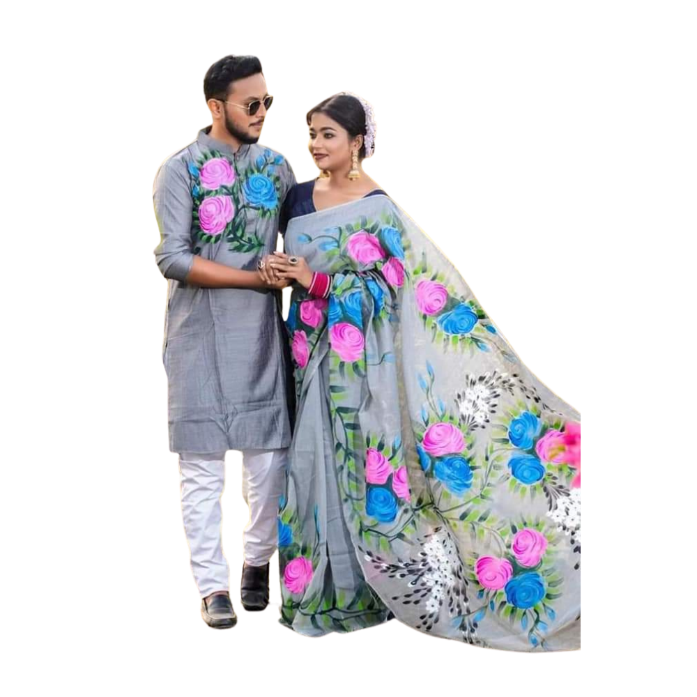 Silk Cotton Saree is a cloth made by weaving silk and cotton fibers and Dhupian Silk Panjabis are made from high-quality fabrics that are soft, breathable, and comfortable to wear. These couple dresses are perfect for special occasions such as weddings, festivals, and religious holidays. They can also be worn for more casual occasions, such as family gatherings and outings with friends.