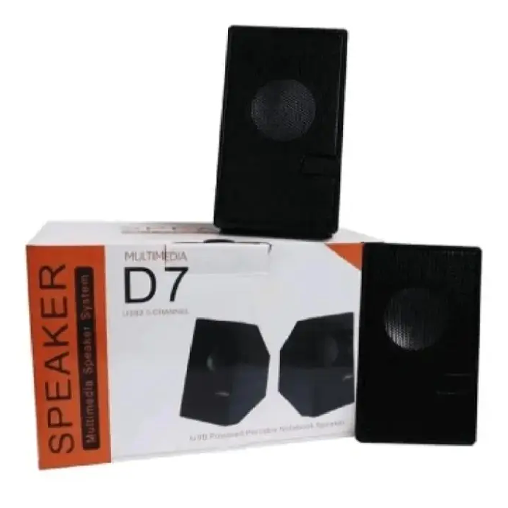 The D7 Multimedia Speaker, a sleek and modern addition to your desktop or laptop setup. This 2.0 channel speaker features 3.5 Aux connectivity and is USB powered for convenient usage. With a crisp white finish, it adds a touch of elegance to your workspace. The volume control allows for easy adjustment, providing a personalized audio experience. Perfect for enhancing your computer audio, this speaker is a must-have for anyone seeking quality sound in a compact design.