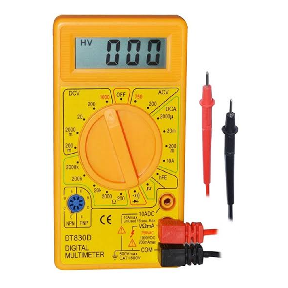 The DT830D Digital Multimeter is a versatile and reliable tool for measuring various electrical parameters. It features a clear LCD for easy reading and a rugged design for durability. This model is specifically designed in yellow for easy identification and visibility.