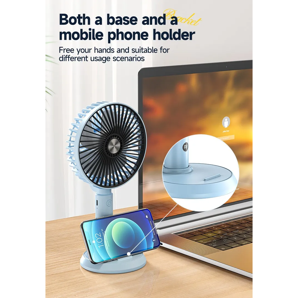 With advanced power management technology, various power supply methods can be connected to the computer, 5V charger, and power bank for power supply and charging. The fan can be up and down 90 ° free to adjust the angle. Three wind power options, wind speed at your disposal, brushless motor, strong wind power. It can be used standing or handheld. The base of the fan can be used as a cell phone holder, free your hands, suitable for different use scenarios. 6. Low battery indicator.