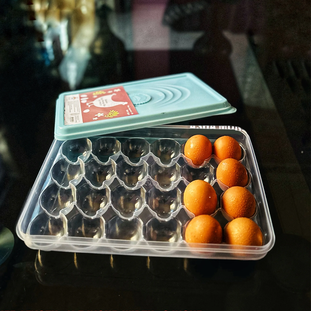 Perfect Storage Box to store eggs safely as well as preserve their freshness. It can accommodate 24 Eggs (2 Dozen) at a time. Transparent egg tray design for easy visibility - never run out of eggs again. Distinctive see-through plastic egg holders make ideal packaging for hygienic use. Hygienic BPA-free & food-grade plastic container keeps eggs fresh - hand wash with mild detergent. This egg holder keeps stacked items in a secure place, whether in the freezer, refrigerator, or cupboard. Fits neatly in the refrigerator.