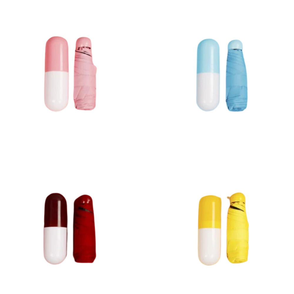 The 7 inch Mini Folding Umbrella with Cute Capsule is a small, lightweight umbrella with a compact design that can be folded to 7 inches. It's made of high-quality polyester material, flexible fiberglass, and aluminum alloy, and has a frosted rubberized handle for a comfortable grip. The umbrella's black vinyl coating blocks heat and UV rays, and it comes with a capsule case for storage.