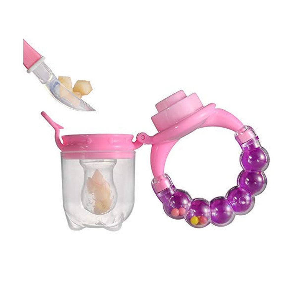 This new feeder pacifier design with a ring handle it is fun for baby feeding.Soft, safe, full food-grade silicone nipple. The buckle of the feeder pacifier is made of PP materials with a rattling handle. A transparent cover upside down can stand up, not easy to dirty. Relieve the baby's sore gums by chewing the soft silicone mesh net with some cold or frozen food.