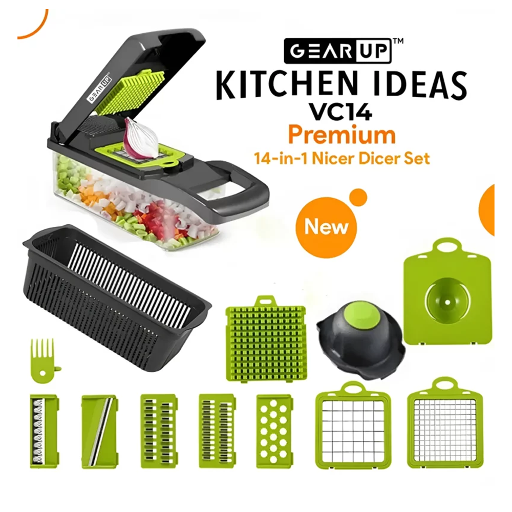 The GearUP VC14 14-in-1 Vegetable and Fruits Cutting Slicer Kitchen Tools in Multicolor is a versatile kitchen gadget designed to simplify and speed up your food preparation. This tool typically includes multiple interchangeable blades and attachments that allow you to perform various cutting tasks like slicing, dicing, chopping, julienning, grating, and even spiralizing a wide range of fruits and vegetables.