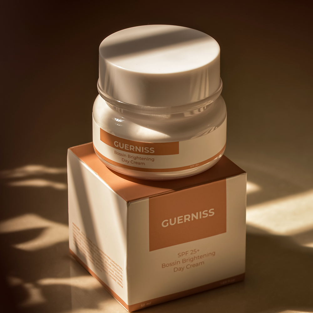 The Guerniss SPF 25++ Bossin Brightening Day Cream is a moisturizer with built-in sun protection that targets brightening and overall skin health, This day cream is formulated to improve skin tone and reduce the appearance of dark spots, uneven pigmentation, and dullness
