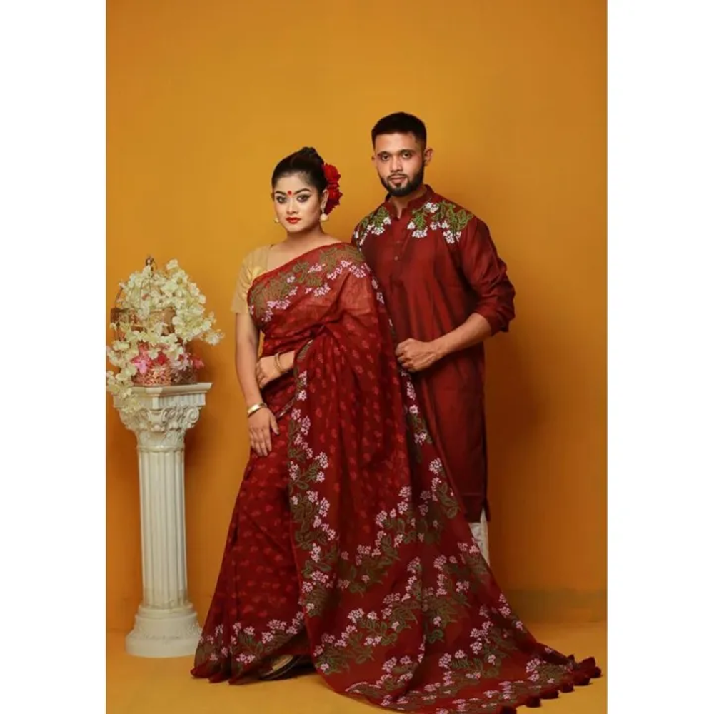 A block print half silk saree is a beautiful and traditional garment that combines the luxurious feel of silk with the intricate designs of block printing. The saree is typically made from a blend of silk and cotton, making it comfortable to wear and drape gracefully. Dupiyan cotton Panjabis are often worn for special occasions,