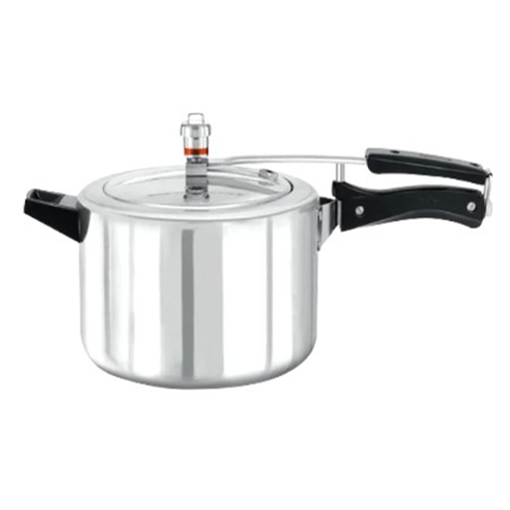 It is a 2.5-liter pressure cooker made of aluminum. It has a silver finish and is equipped with a pressure release valve, safety lock, and heat-resistant handles. It is perfect for cooking rice, beans, lentils, and other tough-to-cook foods.