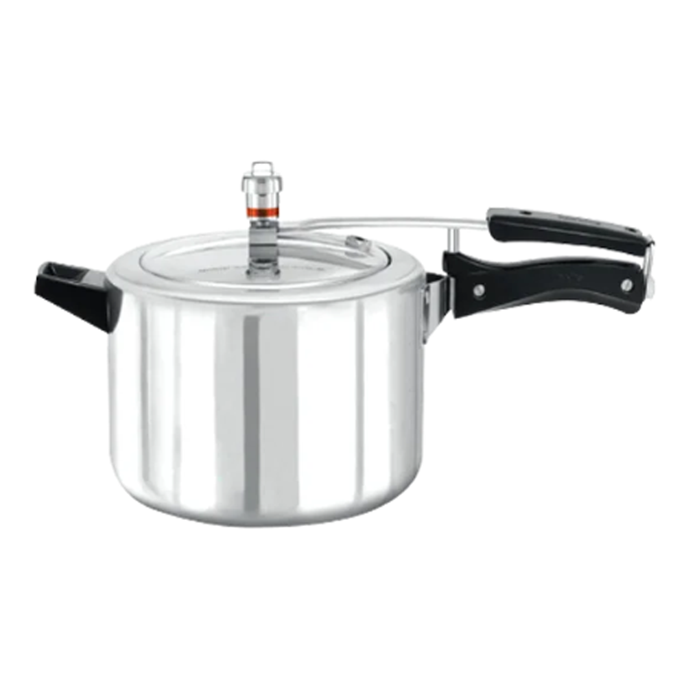 It is a 5.5-liter pressure cooker made of aluminum. It has a silver finish and is equipped with a pressure release valve, safety lock, and heat-resistant handles. It is perfect for cooking rice, beans, lentils, and other tough-to-cook foods.