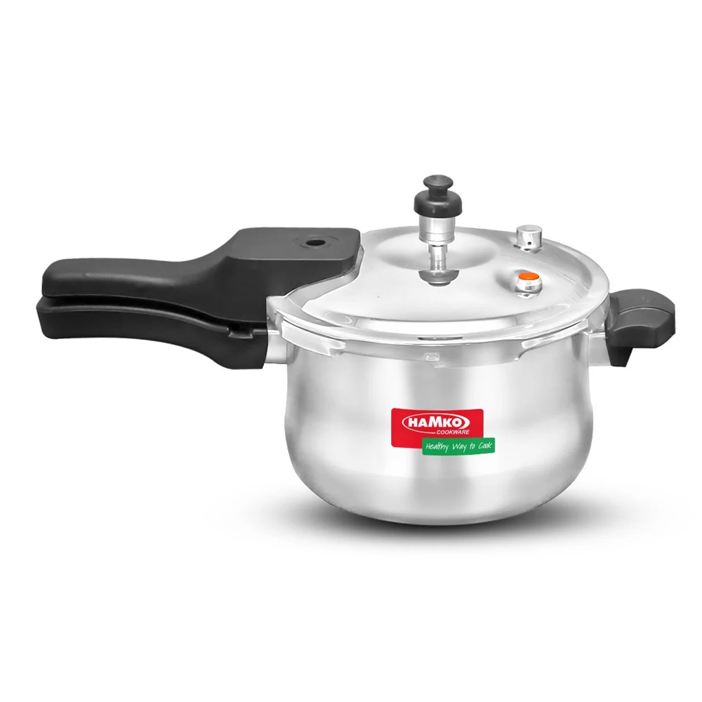 he Hamko SS Pressure Cooker (4.5L) is a versatile kitchen appliance designed for efficient and safe cooking. With a 4.5-liter capacity, it's ideal for preparing meals for medium to large families. Crafted from food-grade stainless steel, it ensures durability and resistance to corrosion. The cooker features an easy-to-use lid mechanism for convenient opening and closing, along with a safety device to prevent over-pressurization. Its compatibility with induction cooktops adds to its versatility, making it a practical choice for modern kitchens.