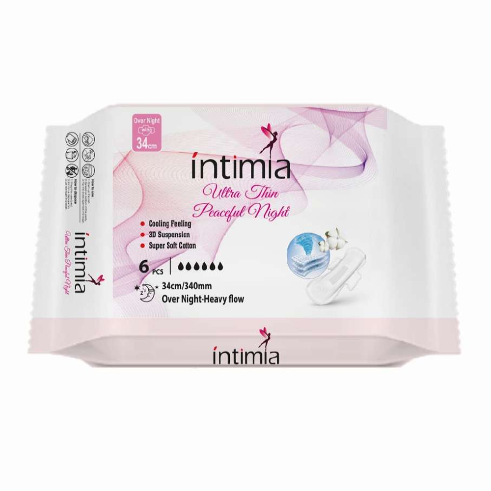 The Intimia Sanitary Napkin Peaceful Night XL (340mm) is designed for heavy flow and overnight protection. Each pack contains 6 napkins. With a soft cottony material and ultra-thin pant system, it ensures comfort and secure fit. The herbal chip offers added hygiene, making it ideal for a peaceful night’s sleep during heavy periods.