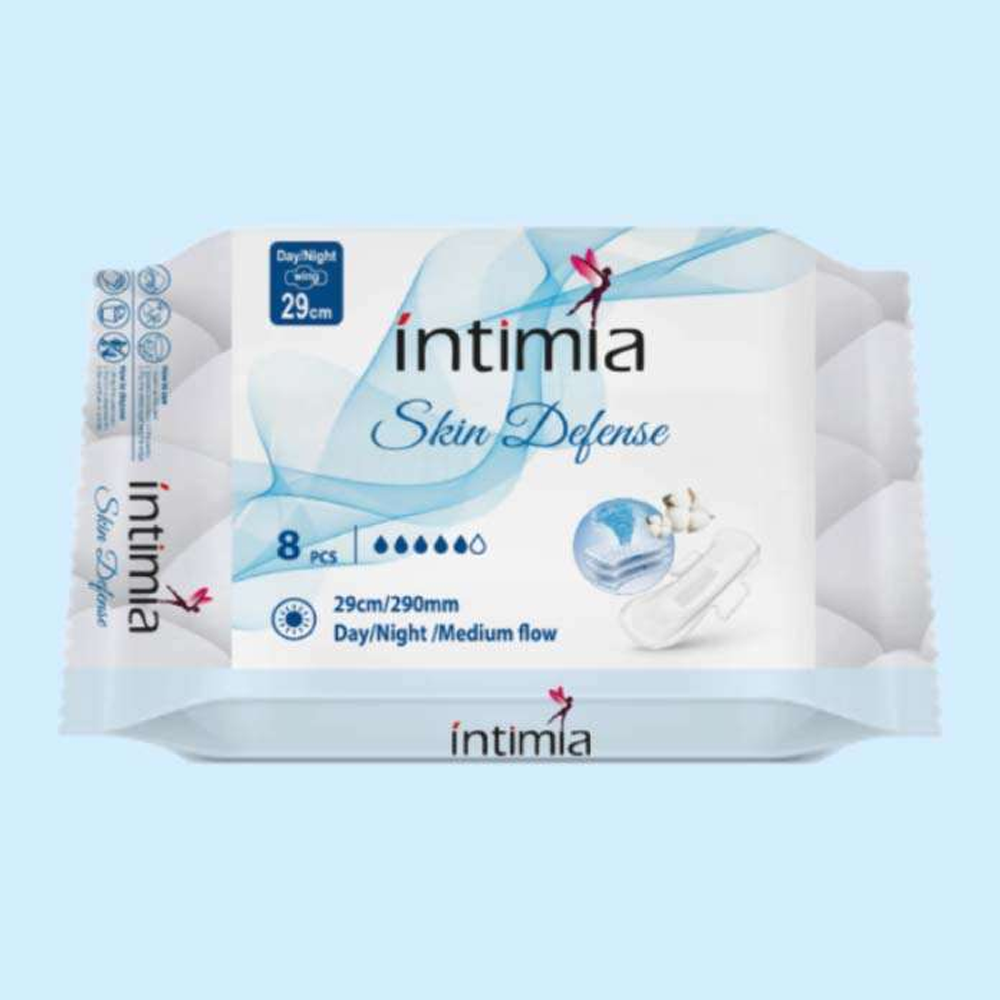 The Intimia Sanitary Napkin Skin Defense (Medium Flow) L (290mm) offers reliable protection for medium flow. Each pack contains 8 napkins. Made with soft cottony material, it features an ultra-thin design and pant system for a secure, comfortable fit. The herbal chip provides added hygiene, making it ideal for regular daytime use.