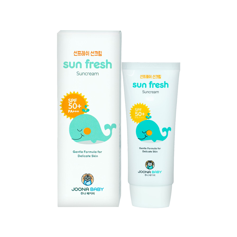 The Joona Baby Sun Fresh Sun Cream SPF50+ PA+++ is a Korean-made sunscreen specifically designed for babies and children's delicate skin. it provides broad spectrum protection against UVA and UVB rays that can harm your baby's skin. UVA rays penetrate deep into the skin and can cause premature aging and wrinkles, while UVB rays burn the skin's surface.