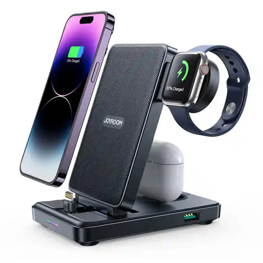 JOYROOM JR-WQS01 4-in-1 Foldable Charging Station for multiple devices, charges your phone, earbuds, and smartwatch simultaneously, ensuring a tidy desktop. Adjustable backplate, suitable for charging phones with cases. You can easily find the perfect viewing angle with a multi-angle adjustable phone charging connector and backplate. A concealable phone charging connector supports horizontal & vertical mode. Foldable design, enhanced portability. Extra USB port, provides power for low consumption devices adjustable charging backplate supports charging your phone with the case on.