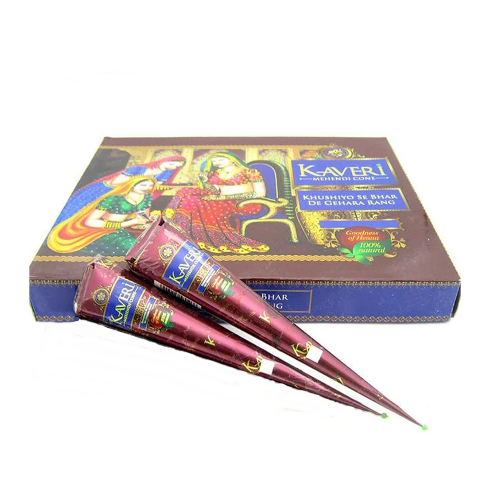 Kaveri Mehedi Cone is made with Natural Henna herbal leaves for hand design on festivals and other occasions. It gives a rich, dark stain to the henna designs as it is made with fresh, premium-quality henna leaves, and no chemical dyes are added in our mehendi cone. It is suitable for all types of skin.