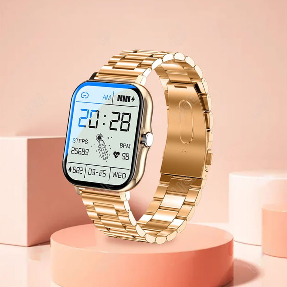The Lige GT 23 Bluetooth Call Full Touch Screen Smart Watch With Extra Silicon Belt - Golden is a stylish and functional smartwatch that is perfect for people who are looking for a way to stay connected and track their health and fitness goals. It features a full-touch screen, Bluetooth calling, and a variety of health monitoring sensors. The watch is also water resistant to 5ATM, making it suitable for swimming and other water activities.
