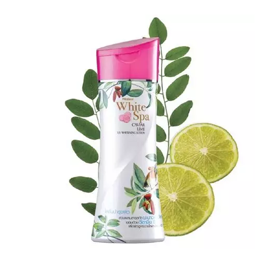 Buy Mistine White Spa Caviar Lime UV Whitening Lotion 200ml online from Cellsii.com. Contains natural lime, rich in natural AHA and vitamin C, and vitamin E to keep the skin soft, smooth, and more youthful. Rediscover your skin's golden radiance. Mistine White Spa Gold Caviar Whitening Lotion with Collagen and Alpha-Arbutin contains collagen extracted from French caviar to moisturize and smoothen skin, keeping it soft, elastic, and healthy.