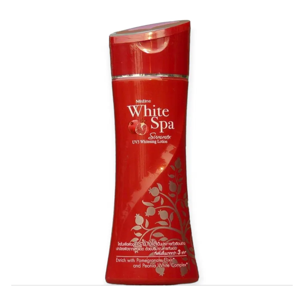 Nourish your skin with Mistine White Spa Summer UV3 Whitening Lotion With Arbutin and Glutathione. Contains Vitamin C extract from Spanish pomegranate to reduce wrinkles and skin discoloration, strengthen the skin's immune response and promote collagen growth for younger-looking skin. Also contains Triple UV Filters to protect the skin from harmful UV rays.