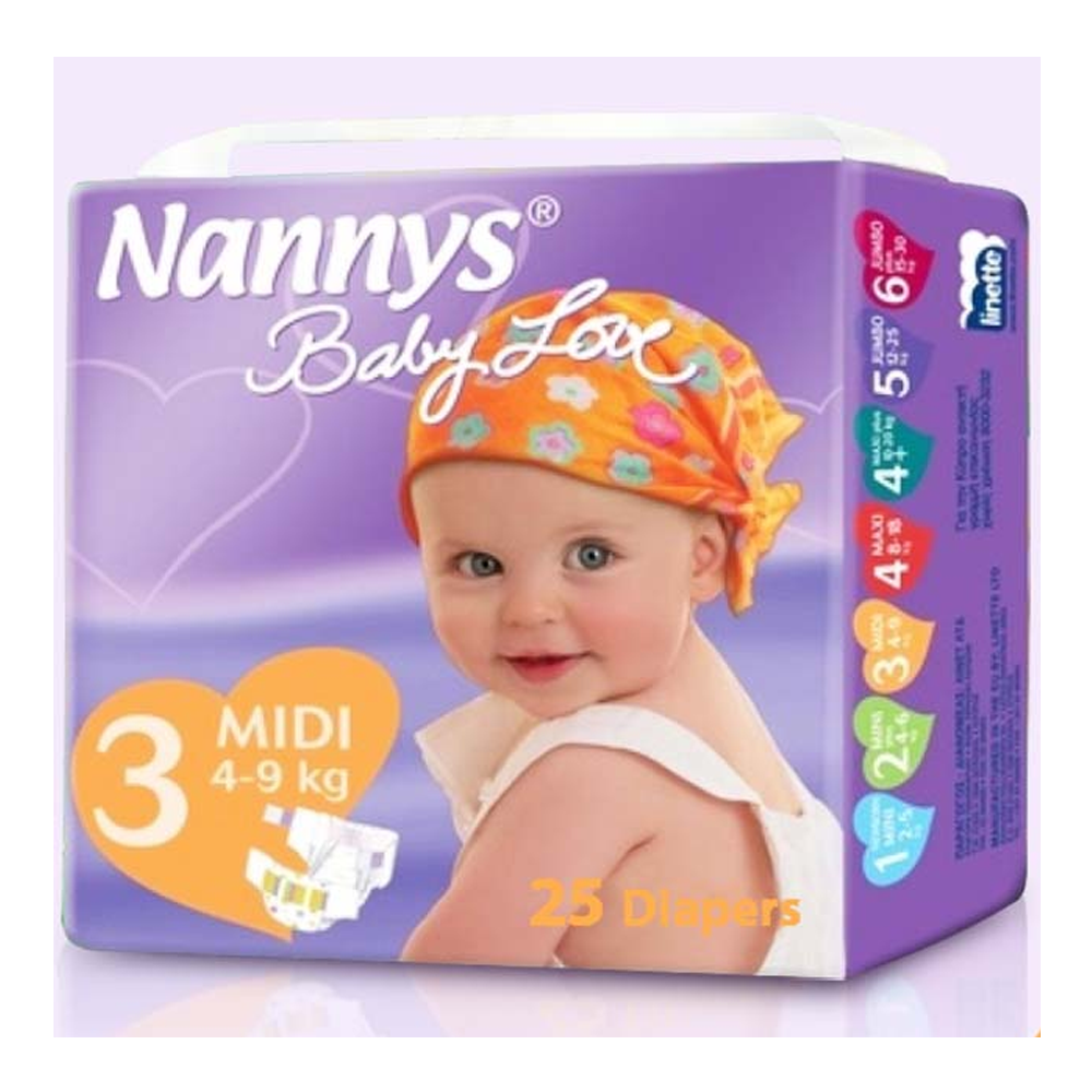 Anatomic design. Extra Absorption, Breathable cloth-like back sheet, Soft side stretch panel. Nanny's Baby Love baby diapers are specially adapted to meet the needs of each stage of a baby’s development. With bettered absorption thanks to their new extra-absorbent core and their anti-leak side leg cuffs, they lock moisture inside. With a breathable outer shell, anatomical design, and elastic side barriers, they provide the care and freedom every child needs.
