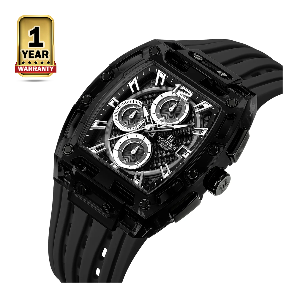 Naviforce 9207 Analog Quartz men's watch that is designed to be stylish and affordable. It features a chronograph design with a black dial, three subdials, and a date window. The watch is encased in stainless steel and has a stainless steel band. it is a stylish and affordable watch that may be a good option for those looking for a casual watch with chronograph functionality.