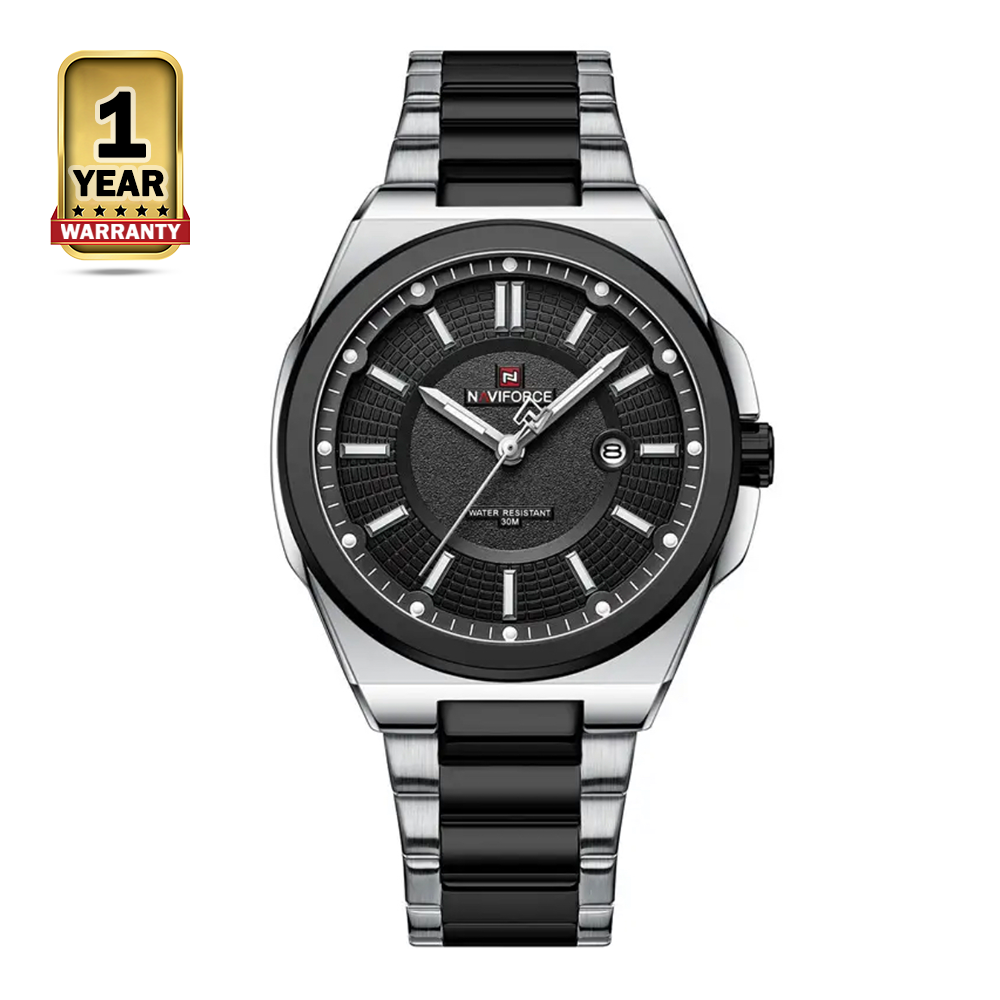 The Naviforce 9212 in black and silver is a popular men's watch that blends sportiness with everyday wearability. The watch features a substantial and masculine 43mm round case made of stainless steel. The black finish gives it a sleek and modern look, while the silver accents add a touch of sophistication. The black dial provides a high-contrast backdrop for the silver hands and markers, ensuring easy timekeeping. It also features subtle textured patterns for visual interest. Luminous hands and markers: Coated with luminous material, making them easy to read in low-light conditions.