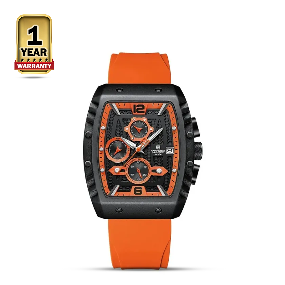 The Naviforce NF8025 is a quartz chronograph watch designed for men with an active lifestyle. It features a sporty design with a black square case made of stainless steel and a black silicone strap with orange accents. The watch face is black with orange hands and hour markers, and it has three subdials for chronograph functionality. It is also water resistant up to 3 ATM, which means it can withstand splashes of water but should not be submerged.