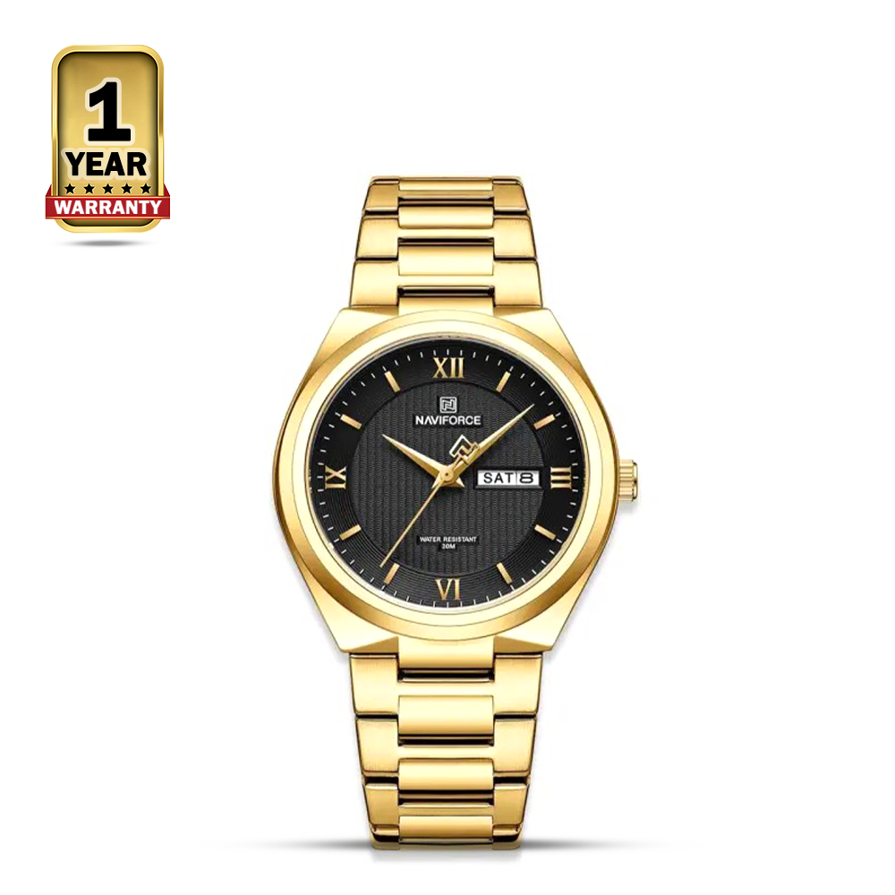 The Naviforce NF8030 is a men's watch that features a silver stainless steel case and bracelet, a white dial with black hour markers and hands, and a date window at the 3 o'clock position. It is water resistant up to 3 ATM, which means it can withstand splashes of water but should not be submerged. A quartz movement powers the watch.