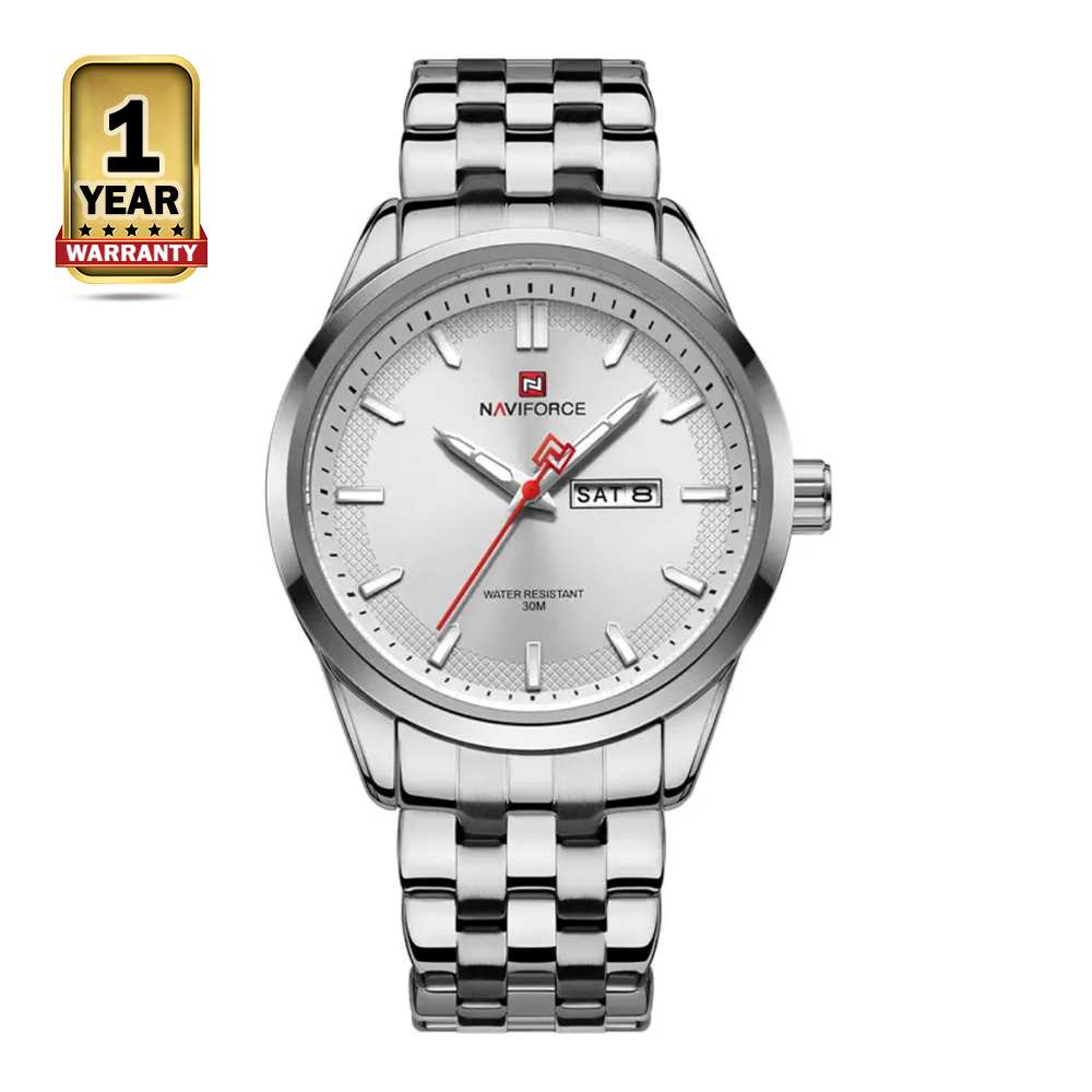 The Naviforce NF9203 is a stylish and functional military-inspired quartz analog watch. It features a stainless steel case and bracelet, making it durable and water-resistant up to 3 ATM (30 meters). This means it can withstand splashes and brief submersion, but it's not suitable for deep diving or swimming.