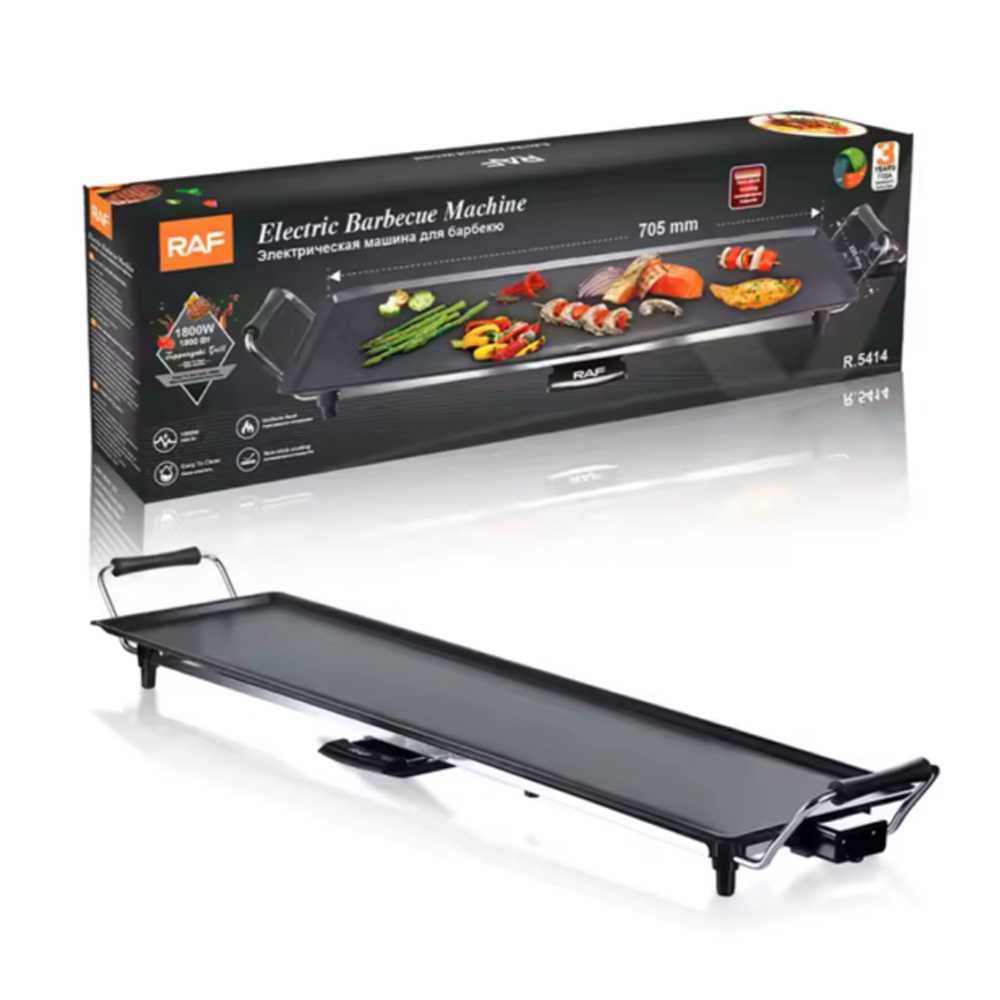 Other attributes application Household power source Electric app-controlled NO material Carbon Steel power (w) 1800 voltage (v) 220 place of origin Zhejiang, China after-sales service provided Free spare parts warranty 6 Month operating language English private mold NO lower grill size 70.5*23.5 brand name RAF model number R.5414 Product Name Electric Barbecue Machine Advantage Easy Operation High Efficiency Plate Type Non-stick Coating Plates Specification and material of power cord 3*0.75² Temperature 5 gears PACKING Color Box + Carton Box
