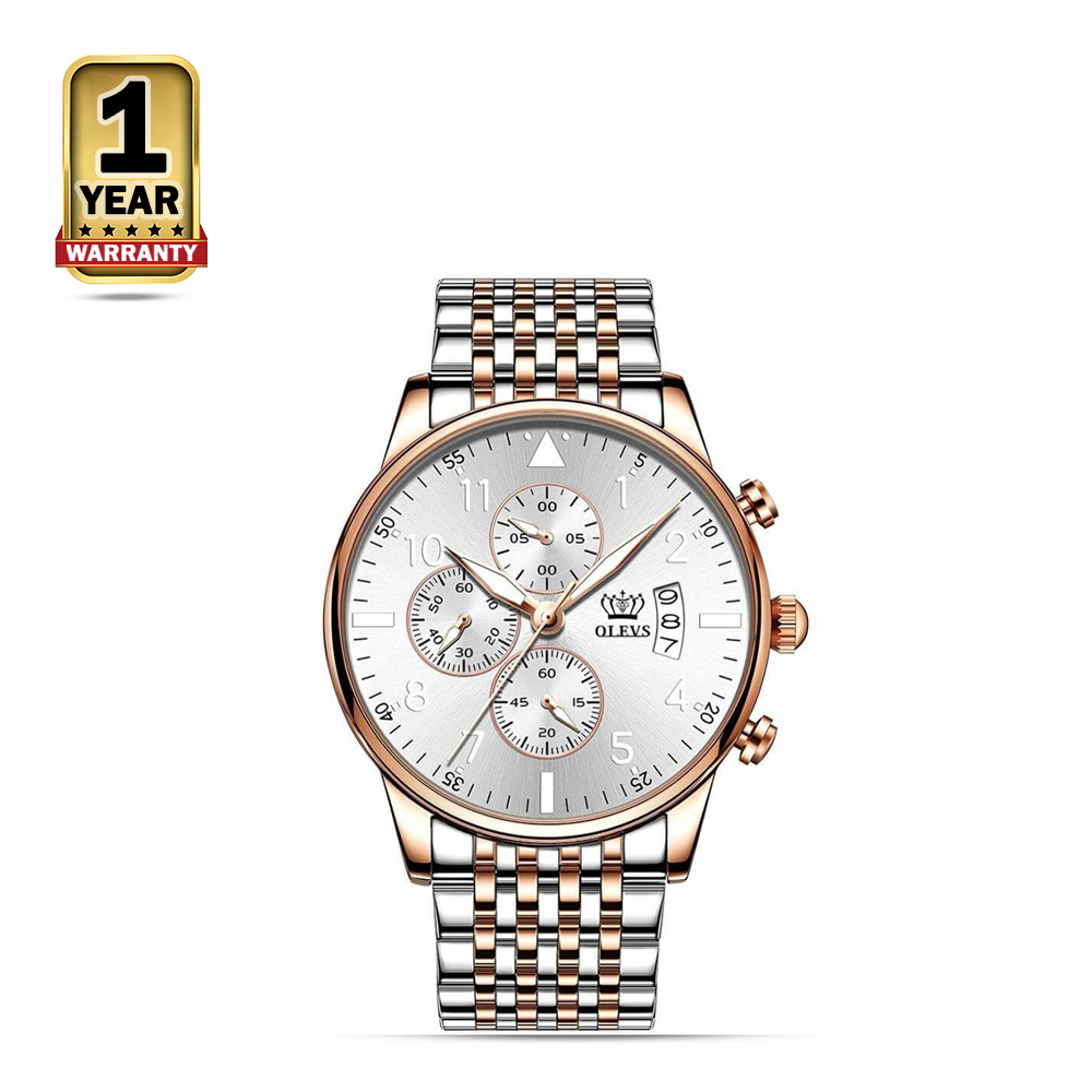 The OLEVS 2869 Stainless Steel Analog Quartz Watch for Men is a stylish and versatile timepiece that is perfect for everyday wear. It features a sleek, round case made of stainless steel with a black dial and silver-tone hands and markers. The watch also has a chronograph function, a date window, and a water resistance of 30 meters.