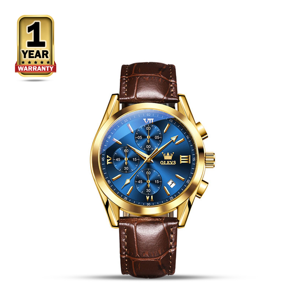 The OLEVS 2872 Leather Quartz Watch for Men in Gold, Brown, and Blue is a stunning timepiece that exudes elegance and style. The watch features a luxurious gold-toned stainless steel case that adds a touch of sophistication to any ensemble. The brown leather strap complements the gold case perfectly, offering a classic and timeless look. Additionally, the blue dial adds a subtle pop of color, enhancing the overall appeal of the watch. With its precise quartz movement, this OLEVS watch ensures accurate timekeeping, while the durable materials make it a reliable companion for everyday wear. Whether for a formal occasion or casual outing, the OLEVS 2872 Leather Quartz Watch for Men combines functionality and fashion effortlessly, making it a must-have accessory for any gentleman.