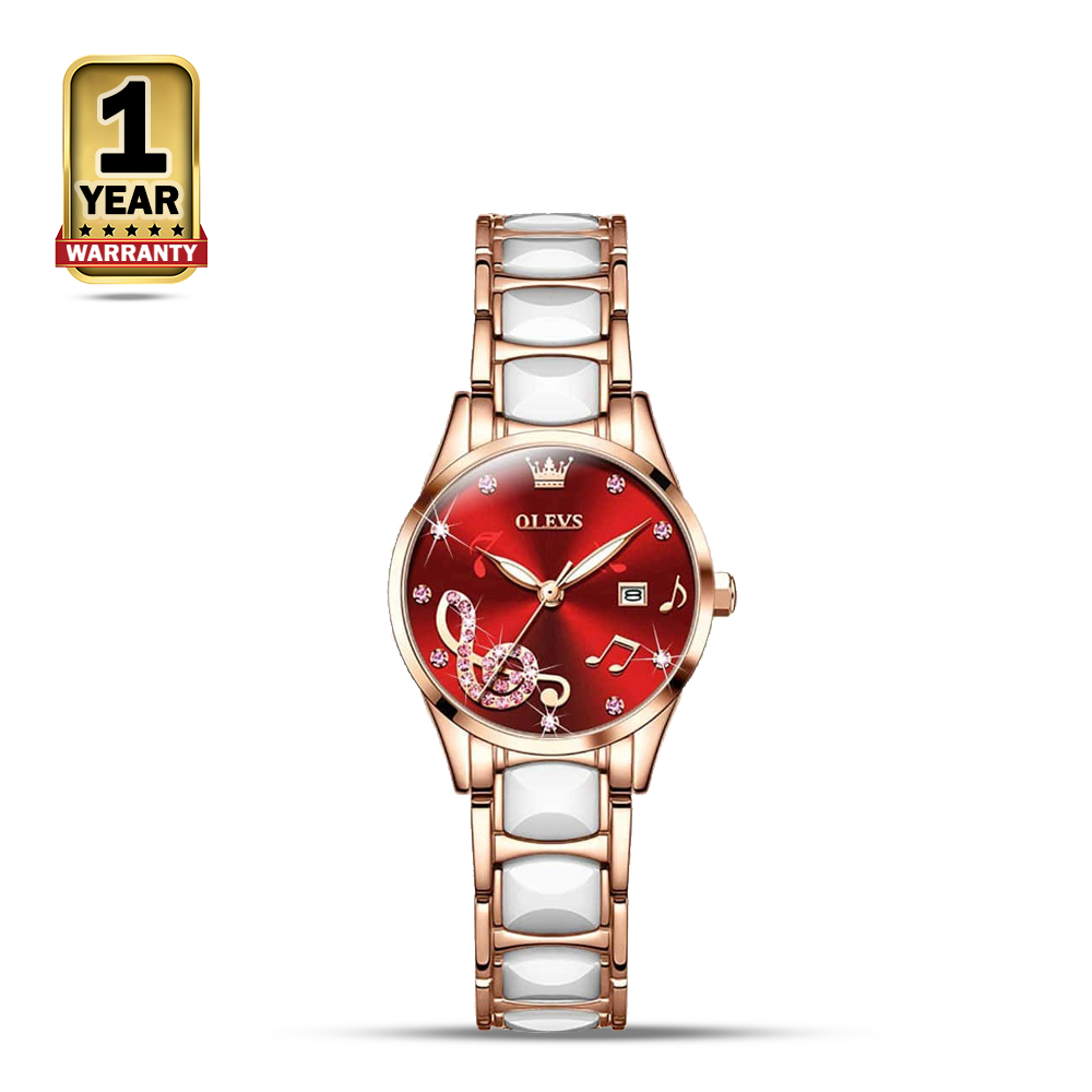 The Olevs 3605 is an analog wristwatch designed for women. It features a red dial with rose gold-colored hands and hour markers, and a rose gold-colored stainless steel case. The band is made from ceramic. The watch is water resistant up to 3 ATM, which means it can withstand splashes of water but should not be submerged. It also has a quartz movement, which is known for its accuracy and reliability.