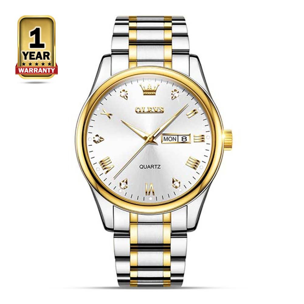 The Olevs 5563 Stainless Steel Analog Wrist Watch for Men in Gold, Silver, and White with a water resistance of 3 ATM (30m) is a sleek and reliable timepiece. The watch showcases a stylish combination of gold and silver stainless steel, creating a striking contrast that catches the eye. The white dial adds a touch of elegance and simplicity, ensuring easy readability of the time. With a water resistance of 3 ATM (30m), this watch can withstand splashes and brief immersion in water, making it suitable for everyday wear. The Olevs 5563 Stainless Steel Analog Wrist Watch for Men effortlessly blends functionality and style, making it a perfect choice for those who appreciate both reliability and fashion-forward design.