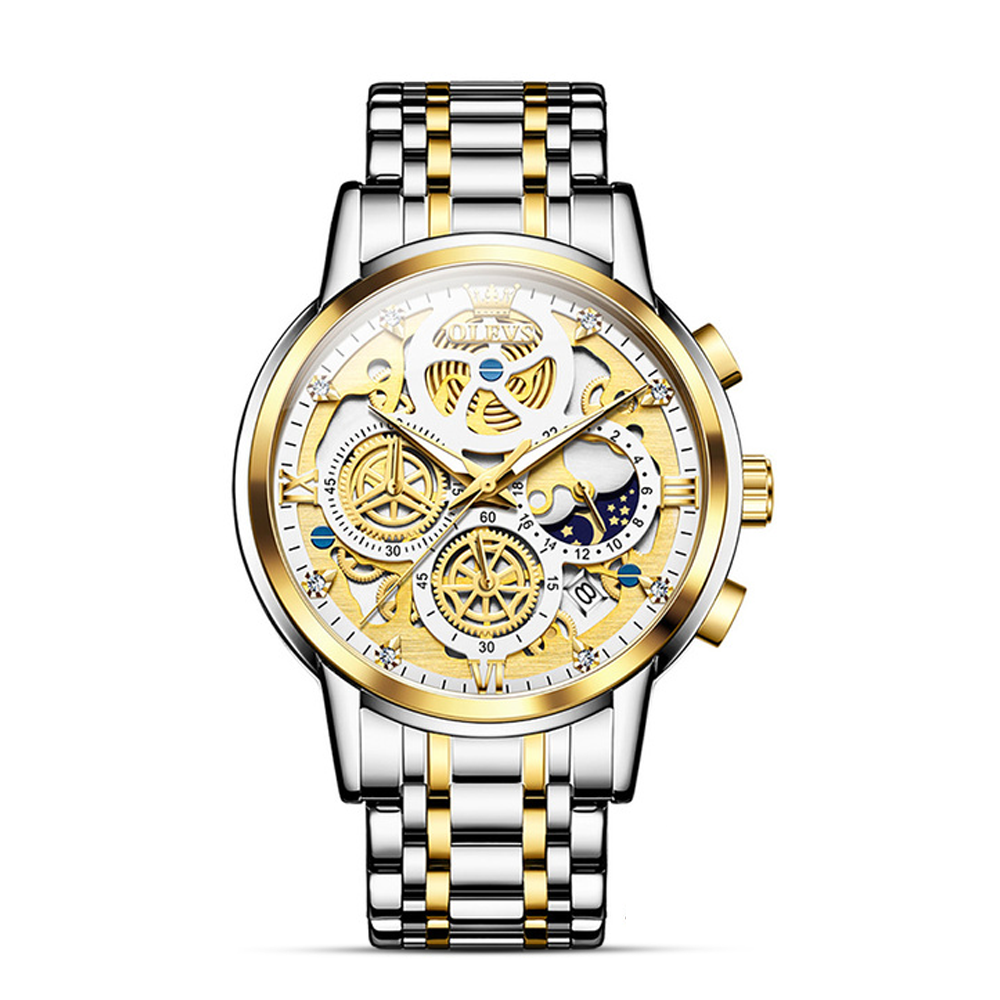 The OLEVS 9947 is a chronograph wristwatch designed for men. It features a gold-colored stainless steel case and band, with a black or blue dial. The watch is water resistant up to 3 ATM, which means it can withstand splashes of water but should not be submerged. It also has a Japanese quartz movement, known for its accuracy and reliability.